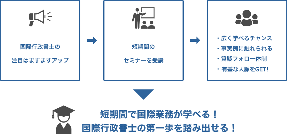 入門セミナーなのに、実際の実務に直結した内容で驚きました。 実務申請書を作成するワークや、実際に講師の先生が受託した事例を聞き、「自分ならどのように対応するか」ということを考え書類を作成するワークなど、入門セミナーに参加しただけで、 国際業務の概要や実務に即した考え方も学ぶことができ、入門セミナーとは思えないほど、充実した内容でした。 この入門セミナーを受講して本当によかったと思っています。 私は、入門セミナーのあとに開催されたマスター講座も受講したのですが、その結果、最終的に3つのことを得ることができました。